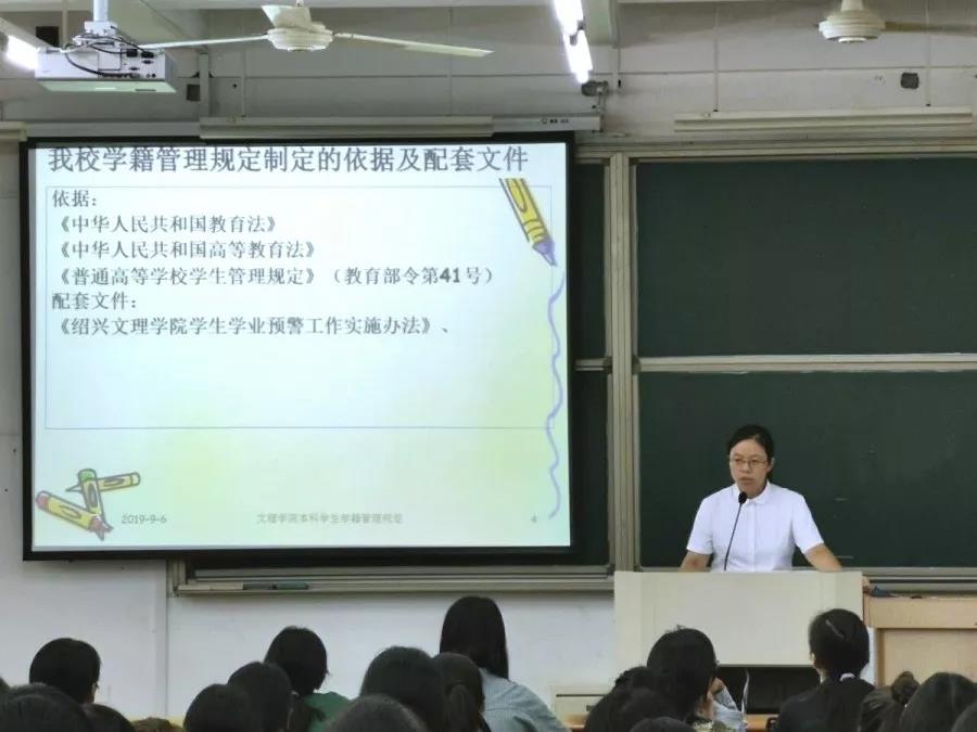 讲座伊始,吴虹老师为同学们讲述了绍兴文理学院的悠久办学历史和优良校风学风。吴老师着重为同学们讲解了《绍兴文理学院本科学生学籍管理规定》、《绍兴文理学院学生考试违纪处分条例(条例)》。
