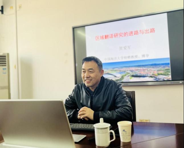 12月25日下午,中国海洋大学贺爱军教授应邀来拼搏在线官方网站开展“区域翻译研究的进路与出路”专题讲座。讲座由院长胡朋志主持。