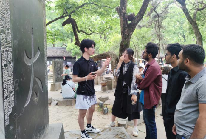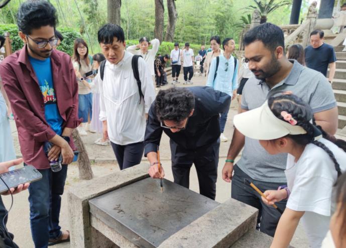 我校外语专业学生更是充分发挥专业优势,承担起涉外讲解服务。面对外国游客,讲解员凭借扎实的语言功底和文化底蕴,用英语向游客详细解释了碑刻上“兰亭”二字的演变历史,从篆书的古朴到书的流畅,再到楷书的端庄,深入浅出的讲解让外国友人惊叹不已。一位来自印度的游客对“曲水流觞”的典故十分好奇,讲解员不仅用英语讲述了当年王羲之与友人在此饮酒赋诗的故事,还现场邀请他参与了“曲水流觞”的文化体验,在欢声笑语中感受中国传统文化的独特魅力。面对对书法艺术有浓厚兴趣的外国友人,讲解员从握笔姿势到运笔方法,现场展示毛笔书写技巧。一位来自孟加拉国的游客在志愿讲解员的“手把手”指导下写下一个“永”字,满心欢喜。一位来自美国的游客激动地说:“这些志愿者的讲解太棒了!以前我只知道中国书法很美,但通过他们的介绍,我了解到了背后如此深厚的文化内涵,这趟旅行太值得了!”